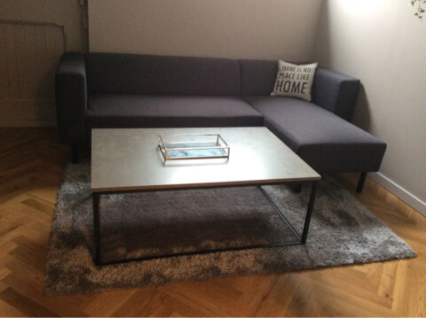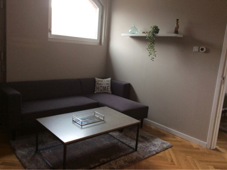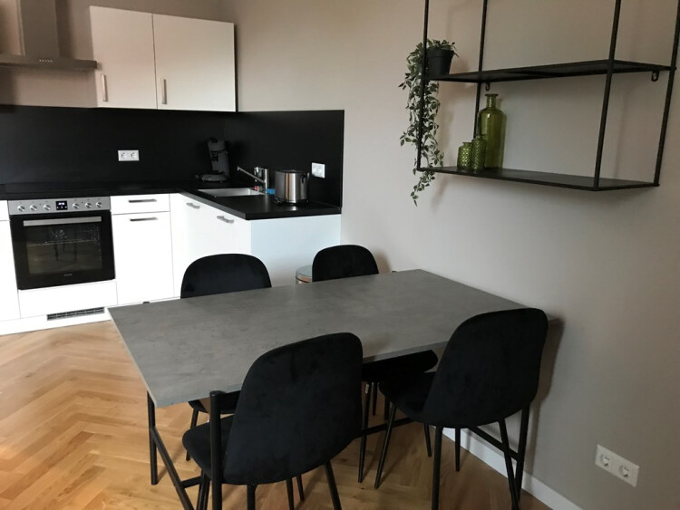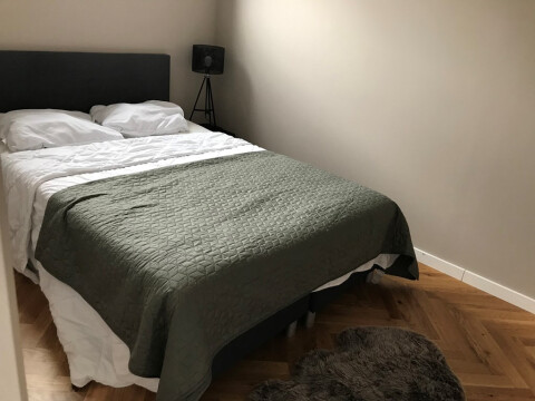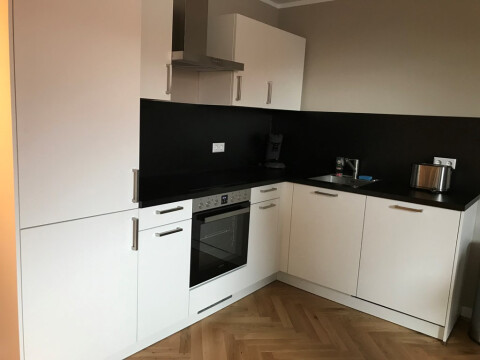 Entrance from the street. Stairs to the first floor with long hallway. Doors to all the apartments. Entrance to the apartment to small hall which is attached to the living area with modern open designer kitchen. Kitchen with appliances such as dishwasher, stove, oven / microwave, ample storage space and fridge / freezer. Bedroom with comfortable boxspring bed and wardrobe space. Bathroom with walk-in shower, sink, towel radiator and toilet. Wooden parquet flooring, centrally heated.