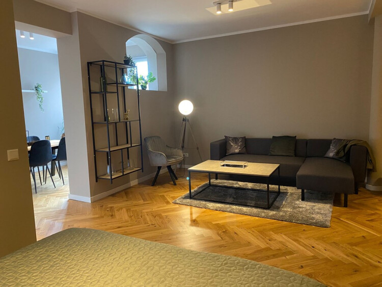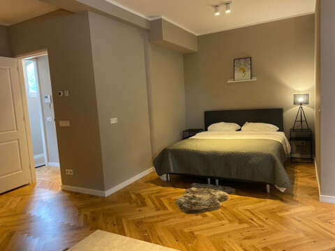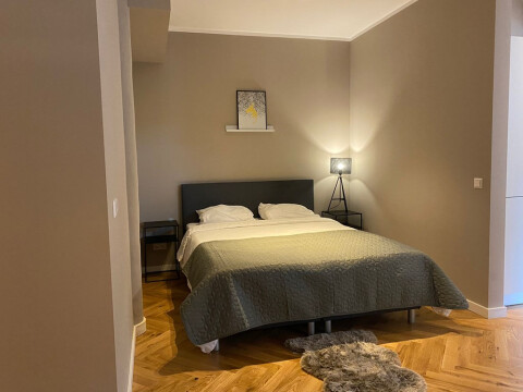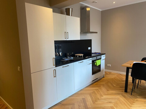 Entrance from the street. Stairs to the first floor with long hallway. Doors to all the apartments. Entrance to the apartment to small hall which is attached to the living area with modern open designer kitchen. Kitchen with appliances such as dishwasher, stove, oven / microwave, ample storage space and fridge / freezer. Bedroom with comfortable boxspring bed and wardrobe space. Bathroom with walk-in shower, sink, towel radiator and toilet. Wooden parquet flooring, centrally heated.