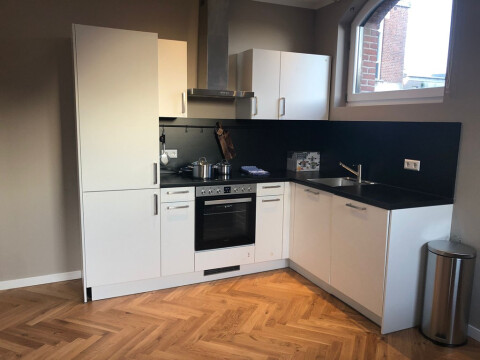 Entrance from the street. Stairs to the first floor with long hallway. Doors to all the apartments. Entrance to the apartment to small hall which is attached to the living area with modern open designer kitchen. Kitchen with appliances such as dishwasher, stove, oven / microwave, ample storage space and fridge / freezer. Bedroom with comfortable boxspring bed and wardrobe space. Bathroom with walk-in shower, sink, towel radiator and toilet. Wooden parquet flooring, centrally heated.