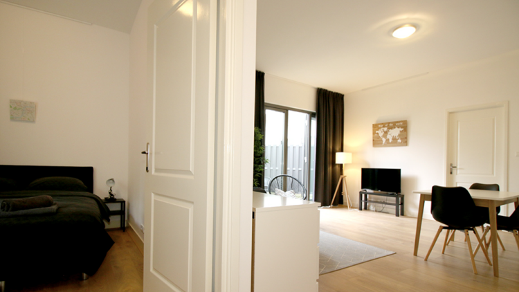 Je komt binnen in de gemeenschappelijk hal. Binnenkomend in the woonkamer. Hiervan uit ga je naar de eerste slaapkamer. De tuin is bereikbaar via de tweede slaapkamer en woonkamer. In de woonkamer tevens ook de open keuken voorzien van wasmachine, vaatwasser, oven, elektrische kookplaat en ijskast/vries combinatie. Badkamer is voorzien van inloopdouche, wastafelmeubel en toilet.