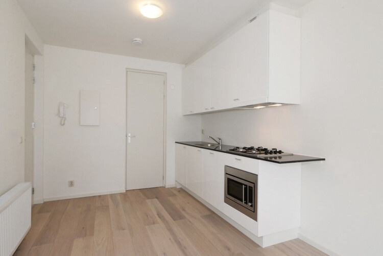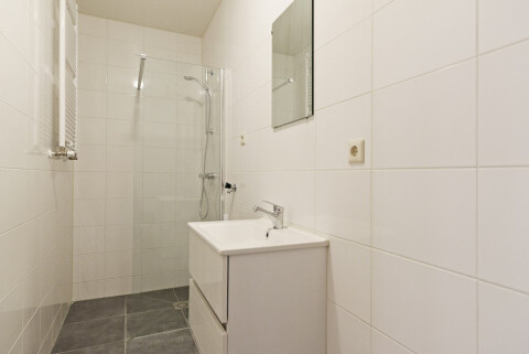Gemeenschappelijke entree op begane grond, gemeenschappelijke fietsenstalling, trap naar de eerste etage, entree woning, lichte woonkamer, luxaflex, open keuken voorzien van gasfornuis, combi magnetron, afzuigkap, vaatwasser en koelkast, moderne badkamer voorzien van ruime inloopdouche, wastafelmeubel, toilet, wasmachine aansluiting, handdoek radiator en slaapkamer.